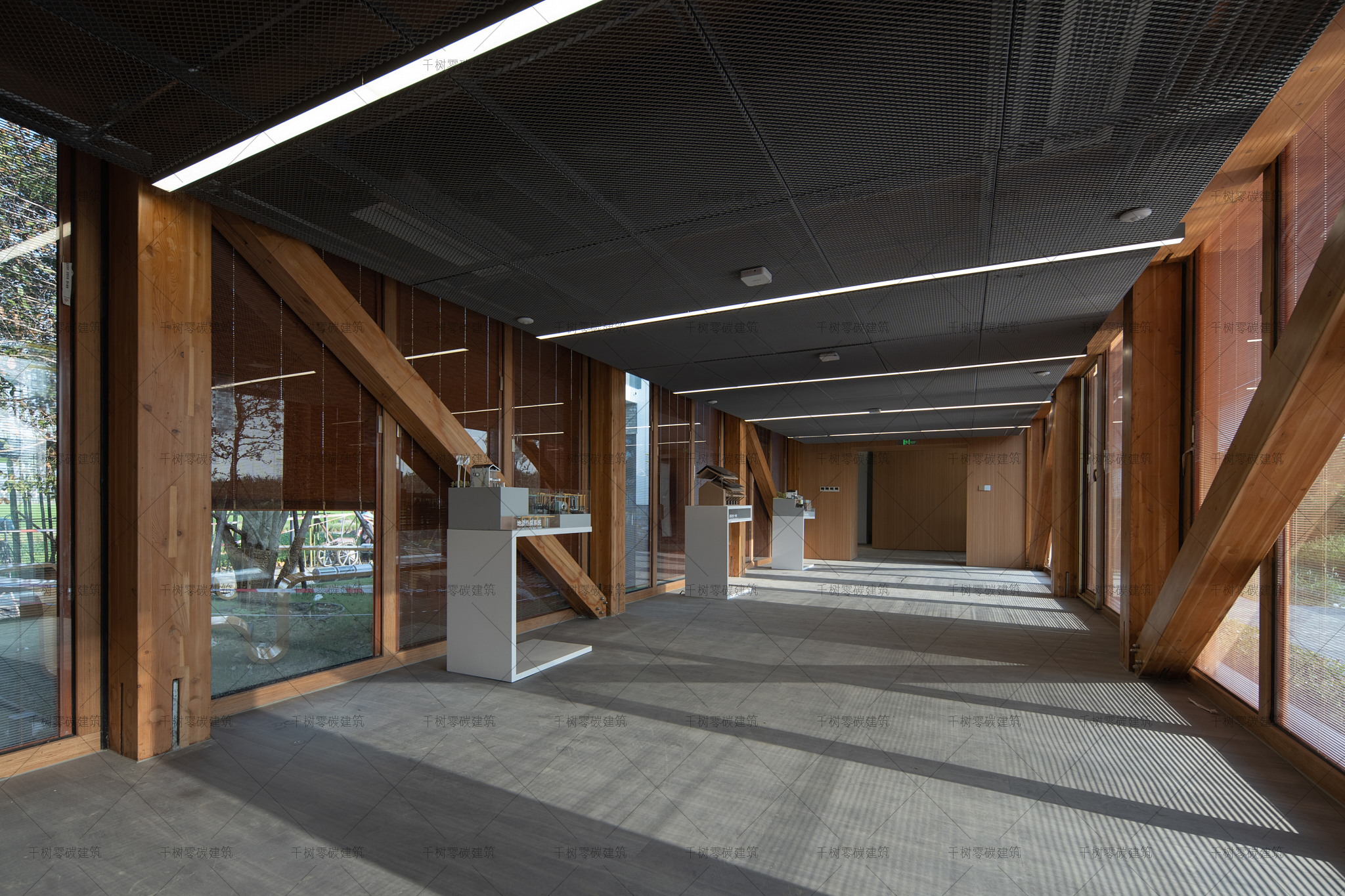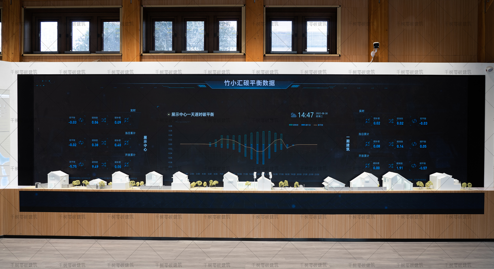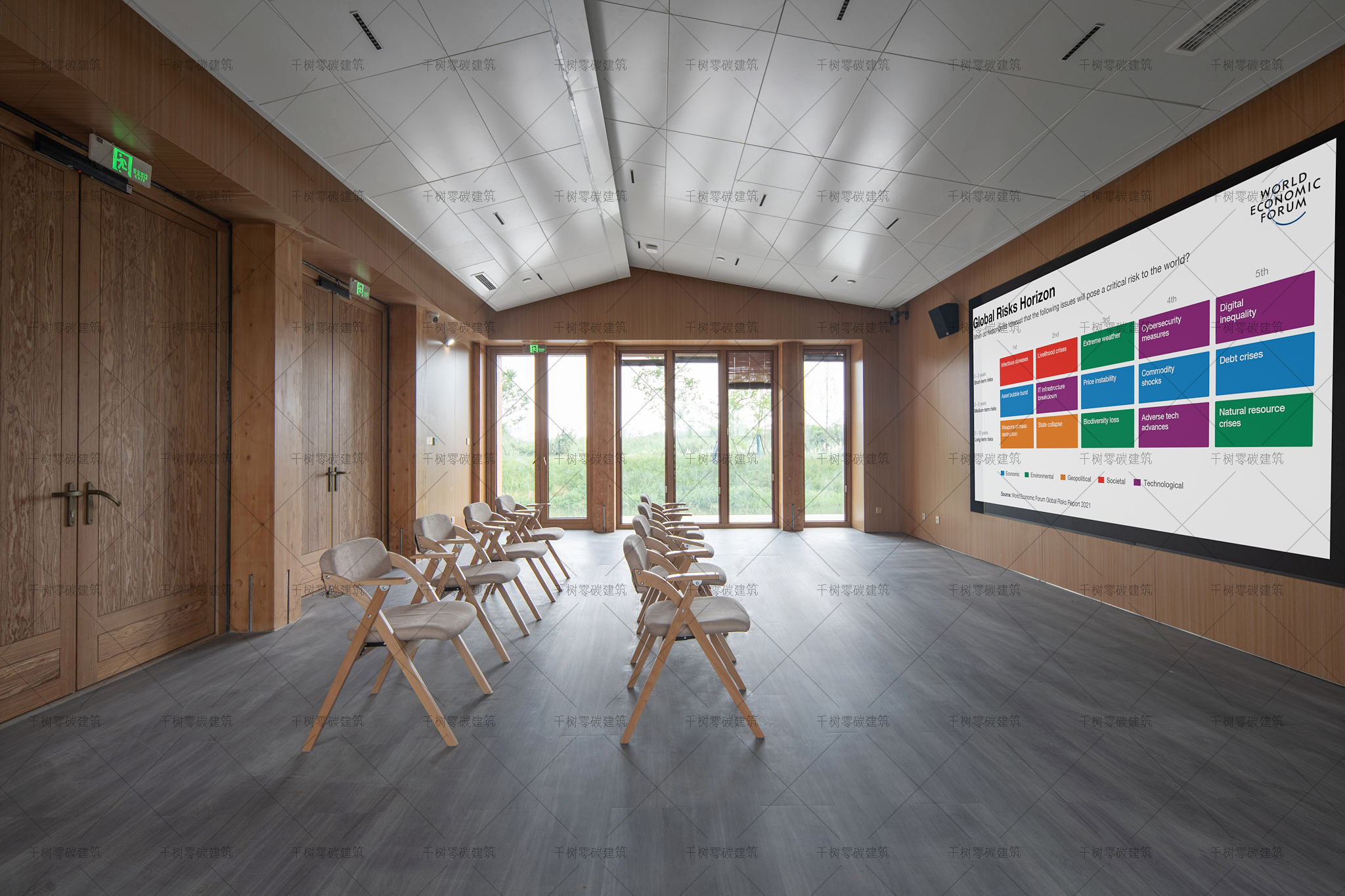 報告廳木屋和展示中心木屋墻面采用隔氣膜+內(nèi)外雙層保溫(內(nèi)保溫184mm厚,外保溫70mm厚)+CLT正交膠合木飾面板,屋面采用隔氣膜+保溫(屋面保溫235mm厚)+光伏瓦的圍護(hù)結(jié)構(gòu),門窗采用被動式節(jié)能阻燃木門窗(內(nèi)置遮陽百葉),加上高能效的技術(shù)設(shè)備:地源熱泵系統(tǒng)、風(fēng)力發(fā)電系統(tǒng)、建筑光伏一體化系統(tǒng)、光儲直柔系統(tǒng)、熱回收系統(tǒng),通過可視化的智慧運維管理平臺高效監(jiān)管、智慧運算,綜合管控與整治,最終實現(xiàn)了零碳建筑的目標(biāo)。