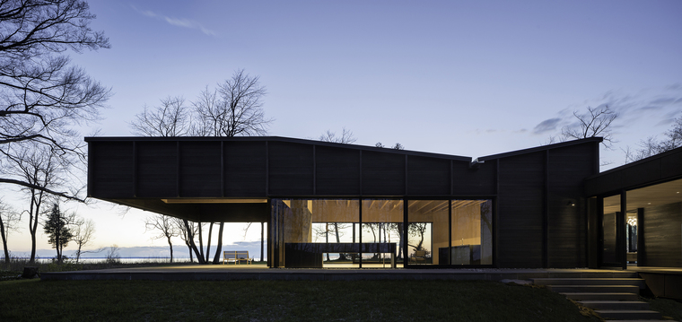 暴露在外的木梁擺放位置使得整個室內(nèi)空間里的拱頂看起來并不對稱。在小木屋的南端,6米長的懸梁屋頂延伸至觀景休息平臺,屋頂為其提供了一種保護(hù),同時對密歇根湖和周圍的美景一覽無余。