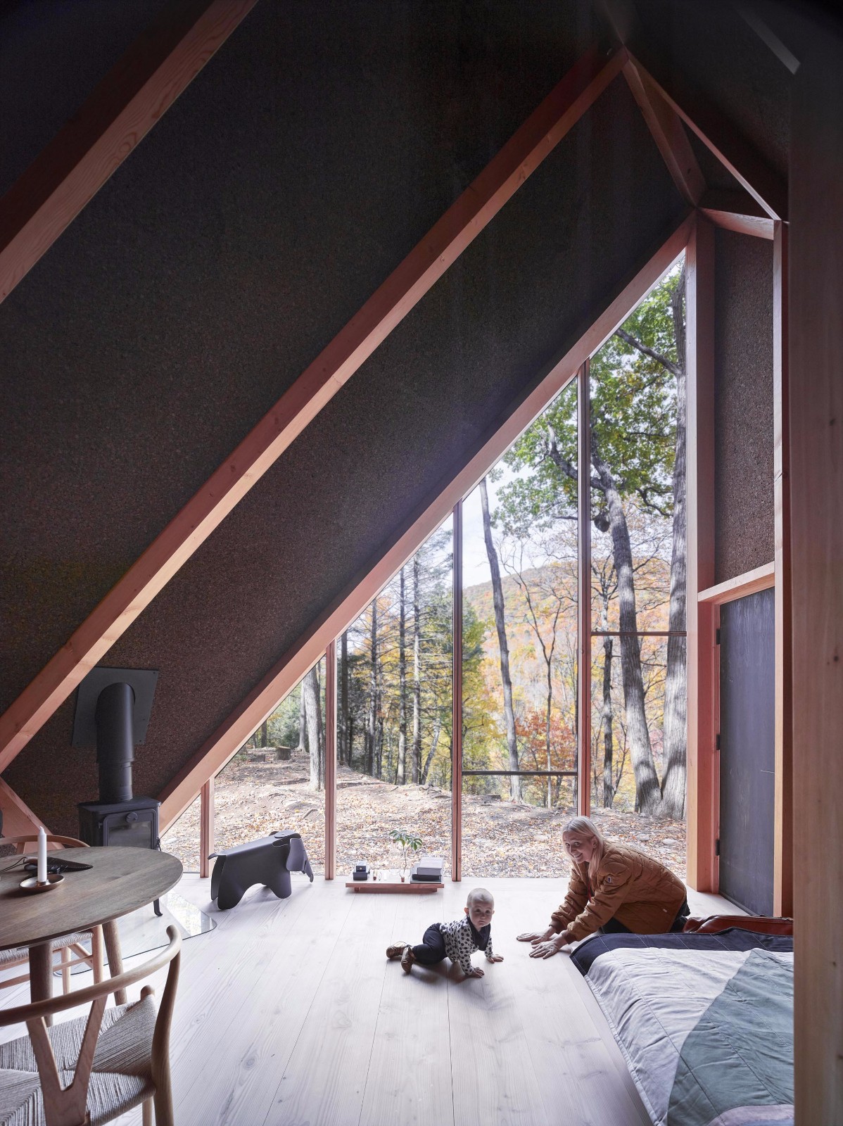 著名建筑事務(wù)所BIG在哈德遜河谷設(shè)計(jì)了一座帶有折角屋頂輪廓線的黑色小木屋。該建筑是預(yù)置住宅創(chuàng)業(yè)公司克萊因集團(tuán)的第一個設(shè)計(jì)模型。該原型住宅起名為A45,是克萊因集團(tuán)為業(yè)主提供的由著名建筑事務(wù)所設(shè)計(jì)的一系列微型住宅中的第一個。