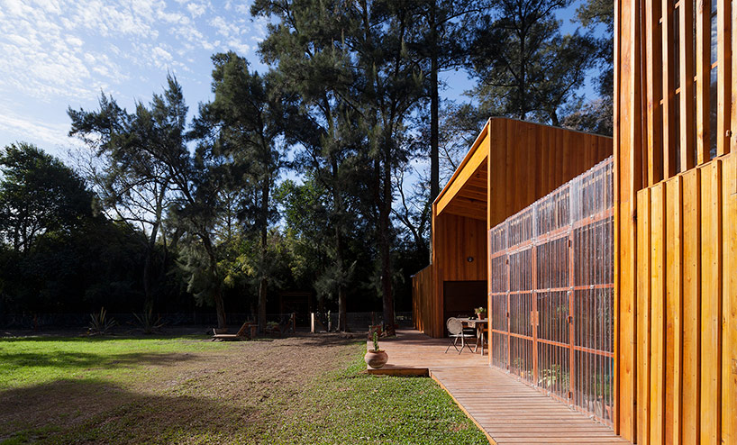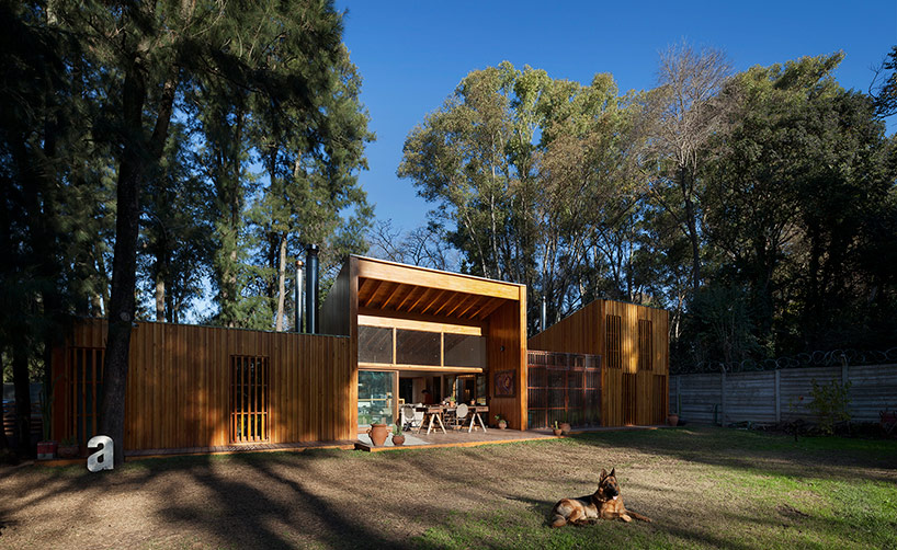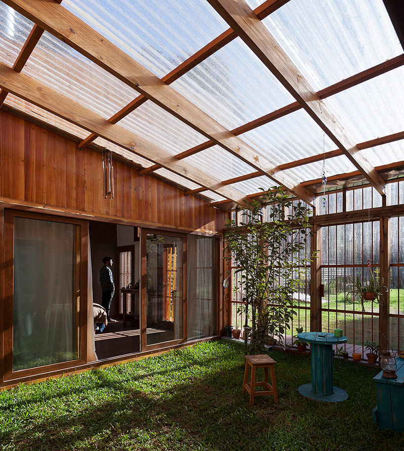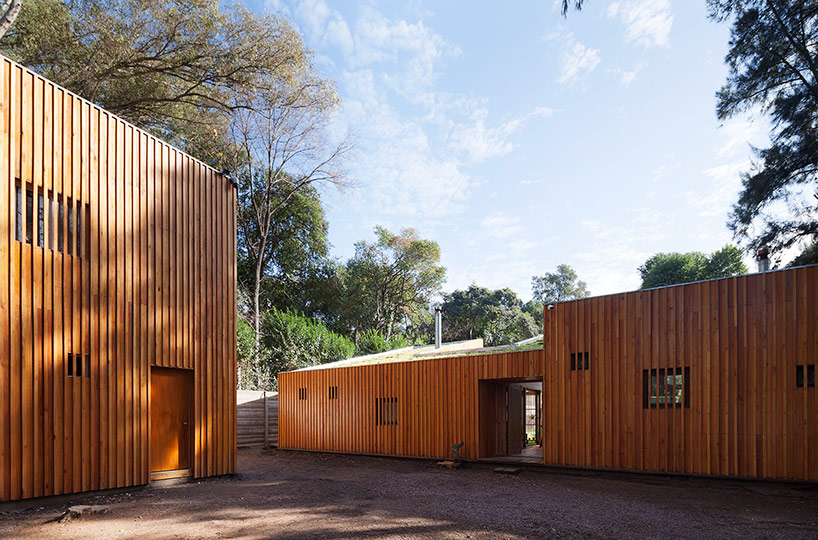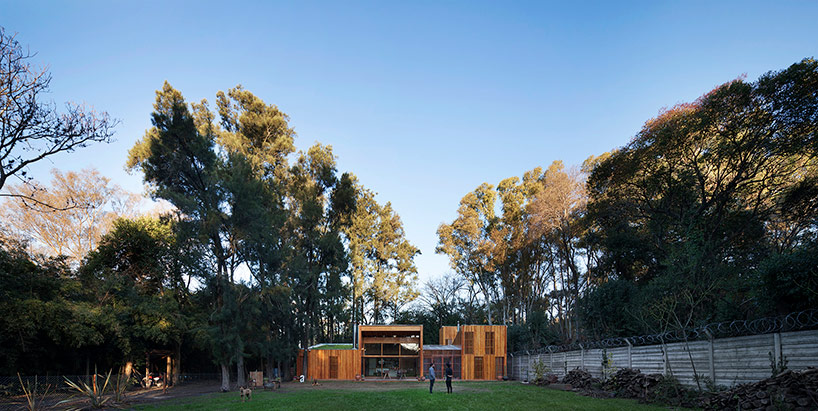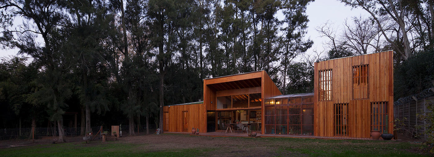 阿根廷建筑事務所IR arquitectura與我們分享的項目,是位于阿根廷布宜諾斯艾利斯(Buenos Aires)郊外托爾圖吉塔斯市(Tortuguitas)的 Casa Aa節(jié)能住宅。在這個養(yǎng)育著孩子的家庭住宅,家里明確地劃分出大人與小孩間的分隔,同時又融入樹木茂盛的場地環(huán)境中,擁有進行室外活動的空間和充沛的陽光。波浪狀聚碳酸酯屋頂覆蓋下的半室外綠色庭院是個溫室和有頂花園空間,并與位于中心位置的矩形起居空間相鄰。共享的起居區(qū)和主臥擁有朝北最高的洞口,使能照射到的陽光最大化,而建筑的外部形態(tài)因此被分割成四部分。上下交替的傾斜綠色屋頂提供了一個很好的天然熱絕緣體,還有助于替換建筑所占據的自然地被。