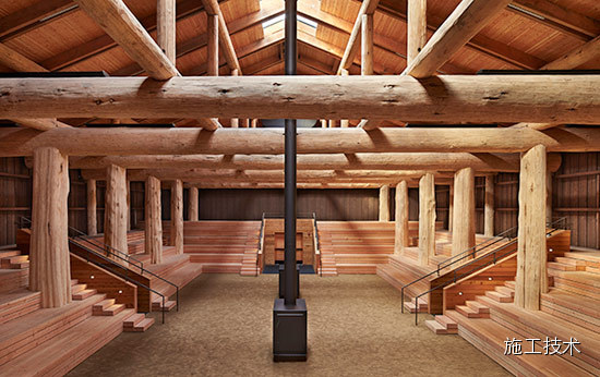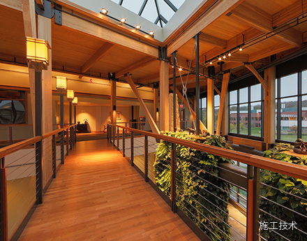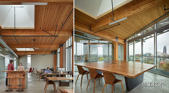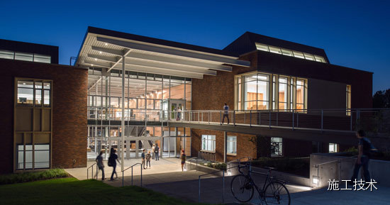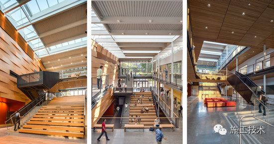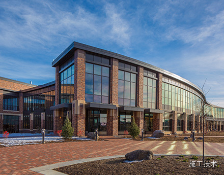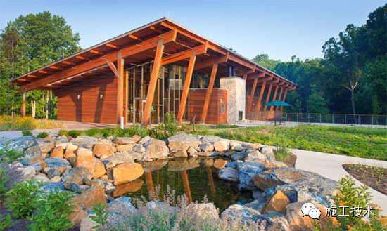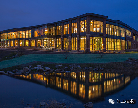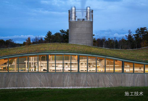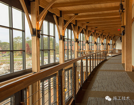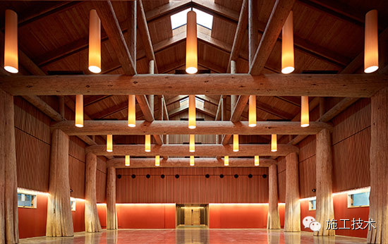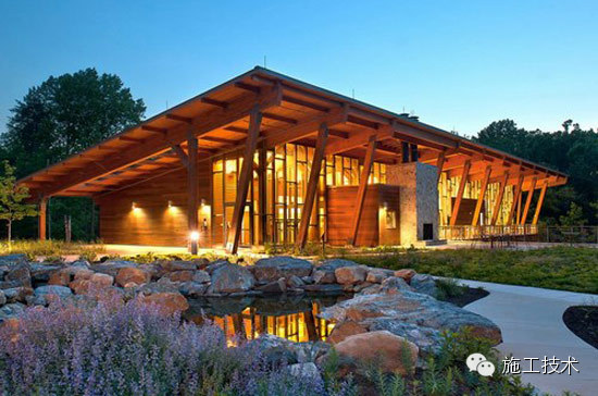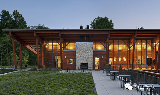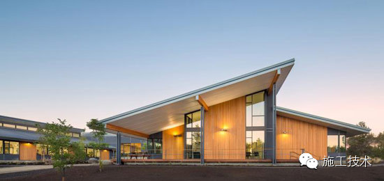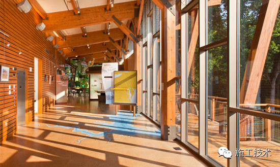 建筑物的桁架為膠合層壓板,從而優(yōu)化了這種可再生資源的結(jié)構價值。膠合板消耗能源少于鋼筋混凝土或鋼材,可用于更長的時間跨度,可承受重負荷,并且擁有復雜 的形狀。該建筑通過了LEED環(huán)境保護認證,包括一套可再生的膠合板結(jié)構系、節(jié)水管道夾具、利用可回收的當?shù)夭牧稀⑹覂?nèi)擁有豐富的自然光線以及高效的機械 系統(tǒng)、照明和外表皮。