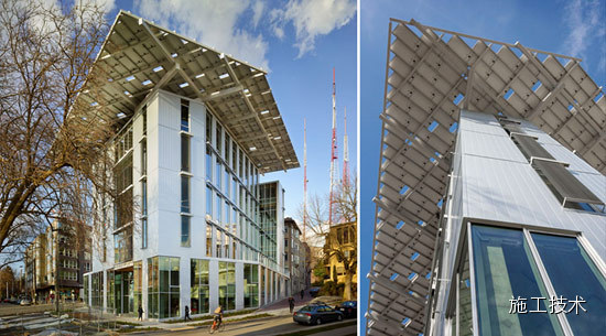 該建筑通過各種不同的系統(tǒng)達到以下這些目標,如一個高性能的建筑圍護結(jié)構;一個旨在優(yōu)化自然光的布局,估計有82%的中心空間將利用自然光采光。仔細與租戶 協(xié)調(diào),通過使用高效率的顯示器、復印機、筆記本電腦、零客戶端和基于云的服務器,以減少他們約75%的“插頭負載”。26孔、400英尺深的地源熱泵空調(diào) 系統(tǒng),將從地球收獲的能源來提供高效的加熱和冷卻,地板輻射系統(tǒng)將有效地加熱和冷卻辦公空間。242千瓦的屋頂太陽能光伏陣列將提供建設所需的所有凈能量。