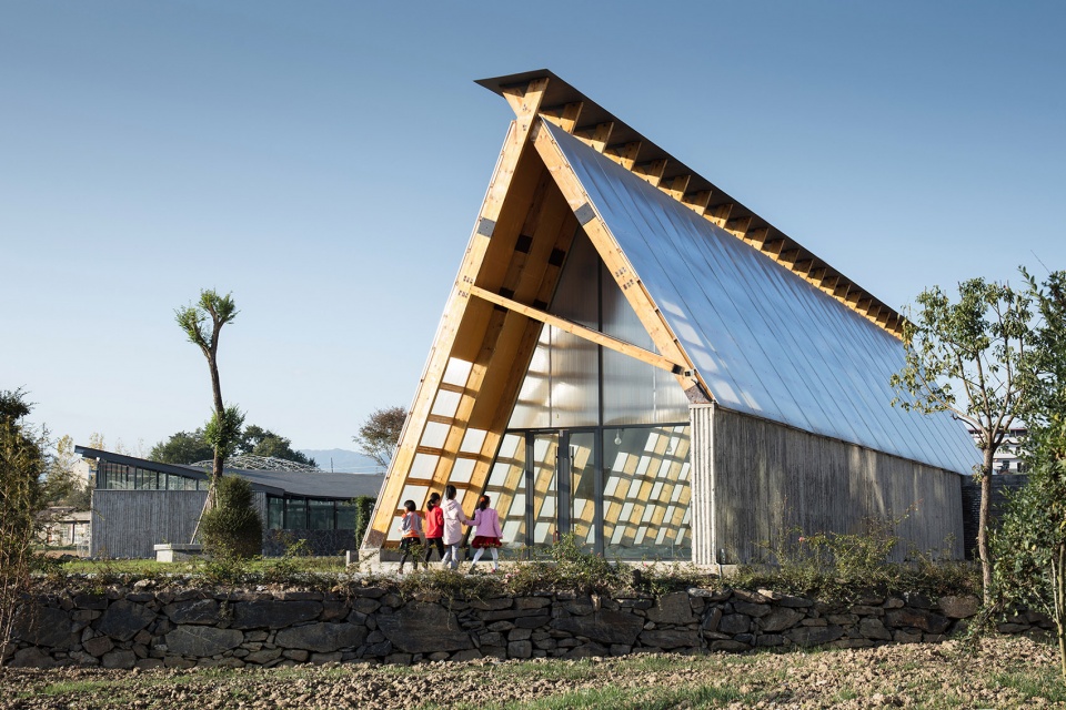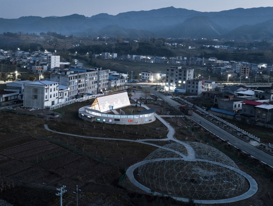 建筑需要面對新的長龍大道,也需要對新老路的轉(zhuǎn)角空間進行回應(yīng)。墻體遇到親子活動的部分,折疊成弧形空間,包裹出其所需的室內(nèi)外場所;而在接待的部分,墻體則流動成線性空間,如巷道般通向村口,作為視覺和功能的導(dǎo)引,其正面又剛好圍合出面對長龍大道的入口場地,同時,巷道的另一個出入口也自然融入到親子活動的路徑上。