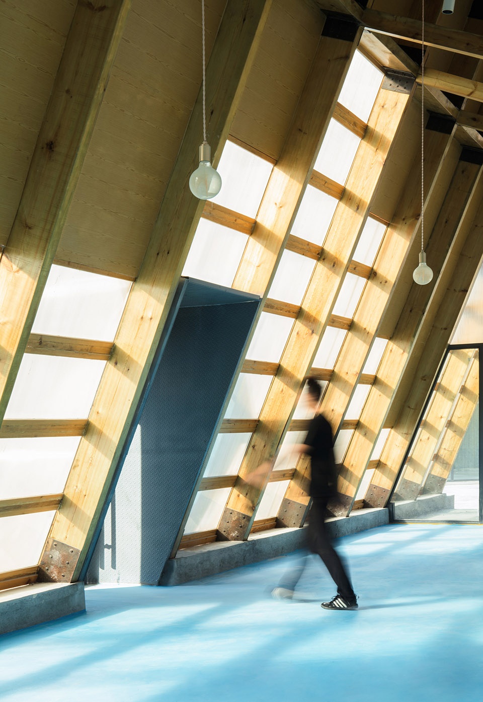 直線空間采用木結(jié)構(gòu)形成交叉的構(gòu)件,中間用斜撐連接,頂部利用交叉形成的平面,蓋上鋼板作為防水構(gòu)造的一部分,木結(jié)構(gòu)外采用陽光板覆蓋,使光線柔和進入室內(nèi),而內(nèi)部則根據(jù)西向的日照分析曲線嵌入高低錯落的木板以減少頂部的陽光輻射。