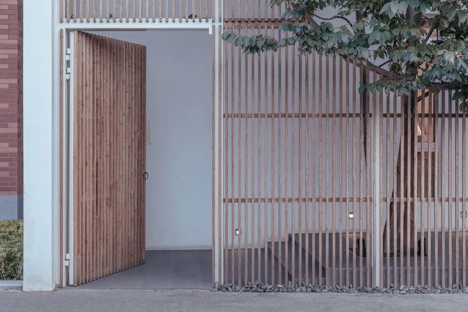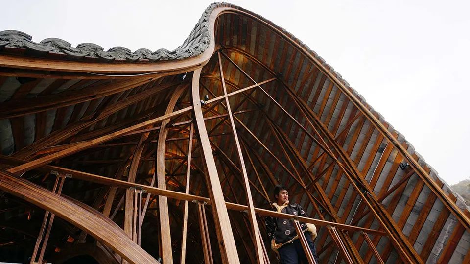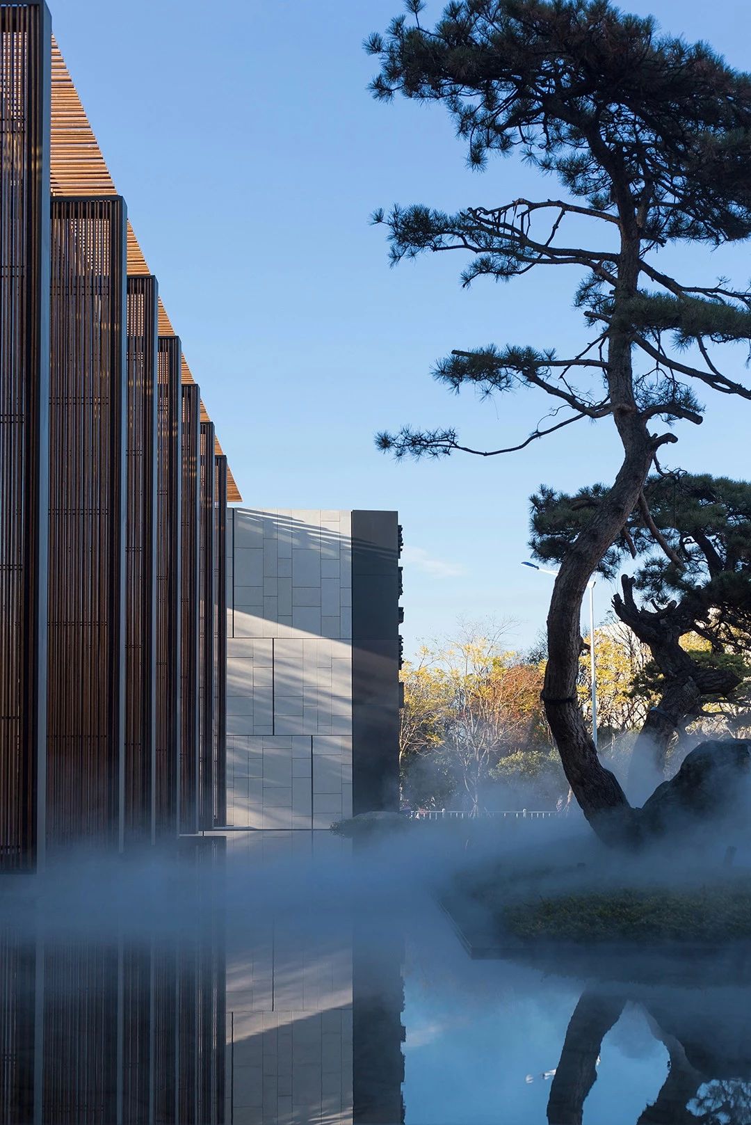 曲面屋頂聯(lián)系起整個(gè)建筑群落,豎向的桿件結(jié)合曲面屋面,組成自由、輕盈的建筑形態(tài),取材延續(xù)中國(guó)古建筑的質(zhì)樸自然,借助青瓦、鋼木等,打造建筑的原始與本真,釋放出閑適愜意的空間氛圍。