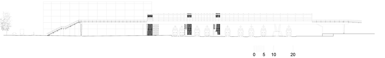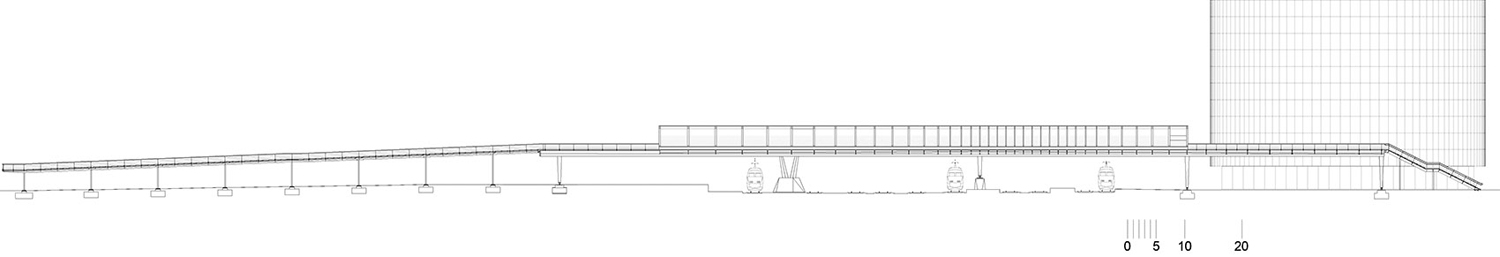 城市開發(fā)計劃對這片區(qū)域進(jìn)行升級。車站一側(cè)的Auguste Gaultier大道上已經(jīng)建造了一棟辦公樓和一座多層停車場;另有一棟酒店正在施工。鐵軌南側(cè)的Fulton街上則將建設(shè)一條新的散步道。這座供行人和自行車使用的天橋是區(qū)域現(xiàn)代化的一部分,由獲得競賽優(yōu)勝的Dietmar Feichtinger建筑事務(wù)所負(fù)責(zé)設(shè)計。他們的設(shè)計遵循城市尺度,跨越鐵軌形成的屏障,并且設(shè)置電梯和樓梯,幫助身體不便的人直接到達(dá)站臺。