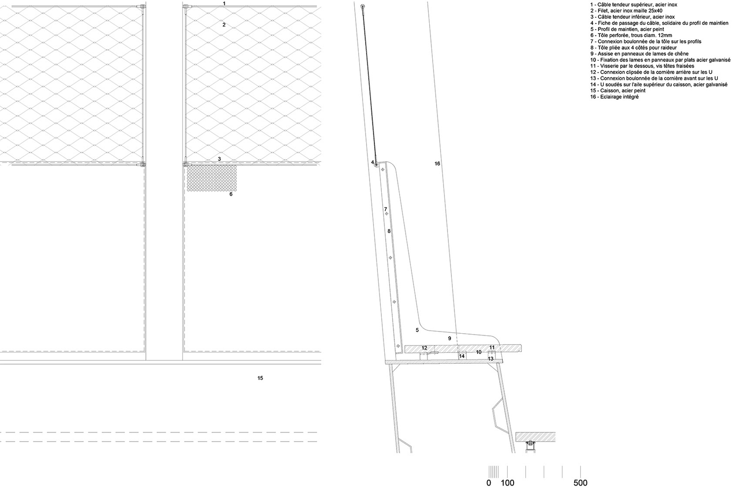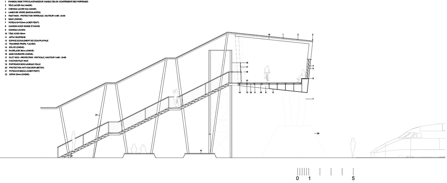 木廊是橋梁中最具代表性的 元素。它們標(biāo)識了橋梁的入口和交匯處,與城市形成對話。同時,它們打斷了人們在橋上的旅程。木廊之間距離不同,結(jié)合橋體本身的弧度,創(chuàng)造了不斷變化的視野,讓人們可以一直從新的角度觀看鐵軌以及來去的車輛。越靠近橋梁中部,木廊越密,隱蔽的空間氛圍邀人停留;在橋梁的兩端,木廊之間的距離更大,提供更加廣闊的城市視野。建筑師對項目體量的考量包含對柱廊形狀的設(shè)計,其傾斜的角度隨運動的節(jié)奏變化,截面在通往橋梁中部的過程中不斷擴大。越來越開放的框架突顯了橋梁在鐵軌上方的重要性。