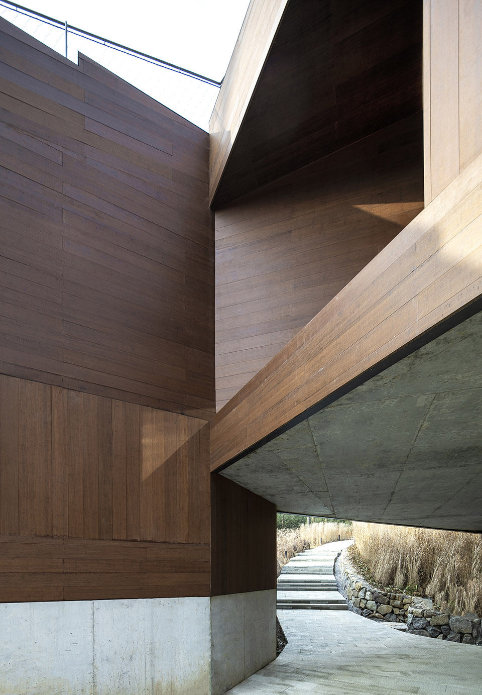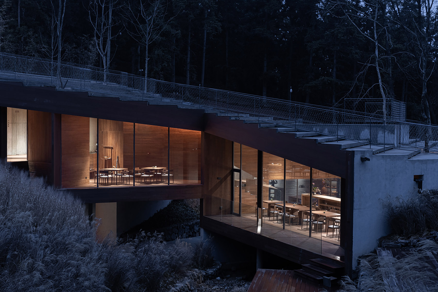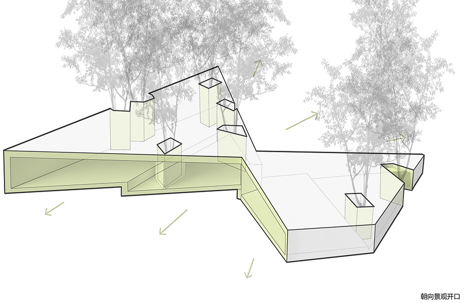 建筑的另外兩側分別嵌入山體之中,架空的蝶狀建筑的下方仍然保留了溪水和山路的通道。為了將部分樹木保留在室內,豎向結構被設計成“柱院”,結構意義上是柱子,空間意義上,是保留了一棵樹的“微院”。屋面是一個臺階狀的坡屋頂,可作為小型演出的森林劇場,室內空間被這個大坡屋頂統(tǒng)一起來,并因為不同地面標高的變化而富有節(jié)奏。