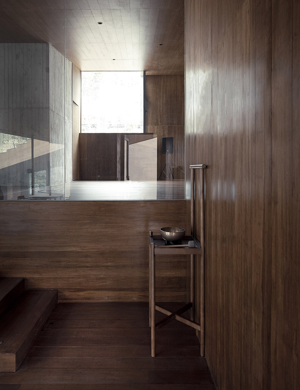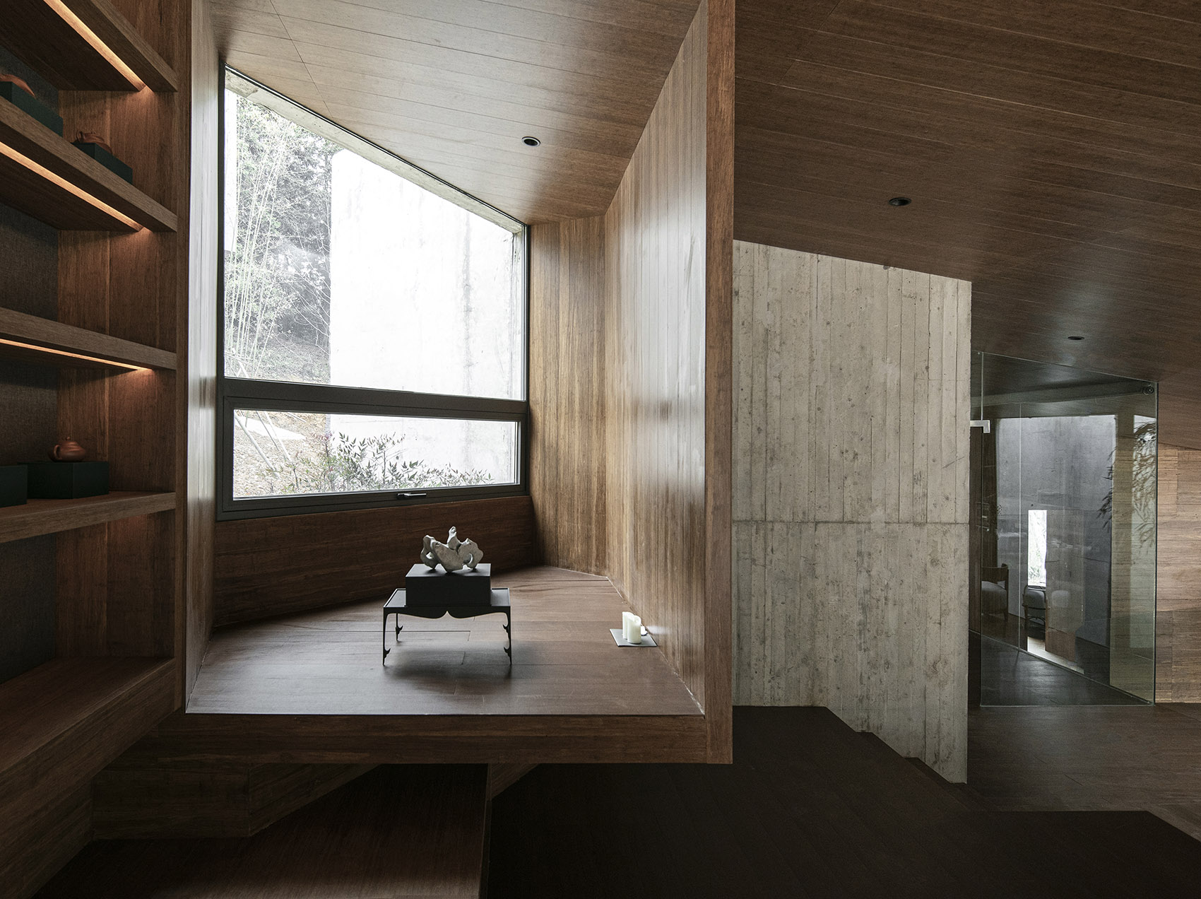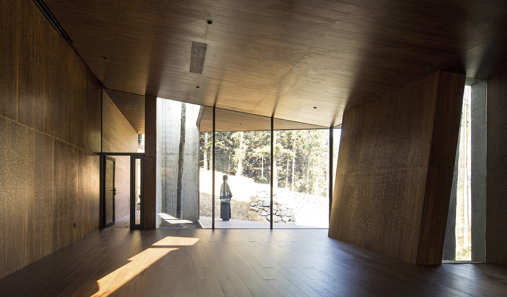 內部每個標高的空間,都有相應的落地玻璃立面,錐形的頂部設置了可以看向天空和樹冠的天窗,形成了分別朝向不同的方向看風景的組合,將外部的景觀投射到整個空間內部,外部的風景成了建筑的主要元素,形成空間特有的張力,這一切都是為了居于室內可以獲得對自然更多的感知。