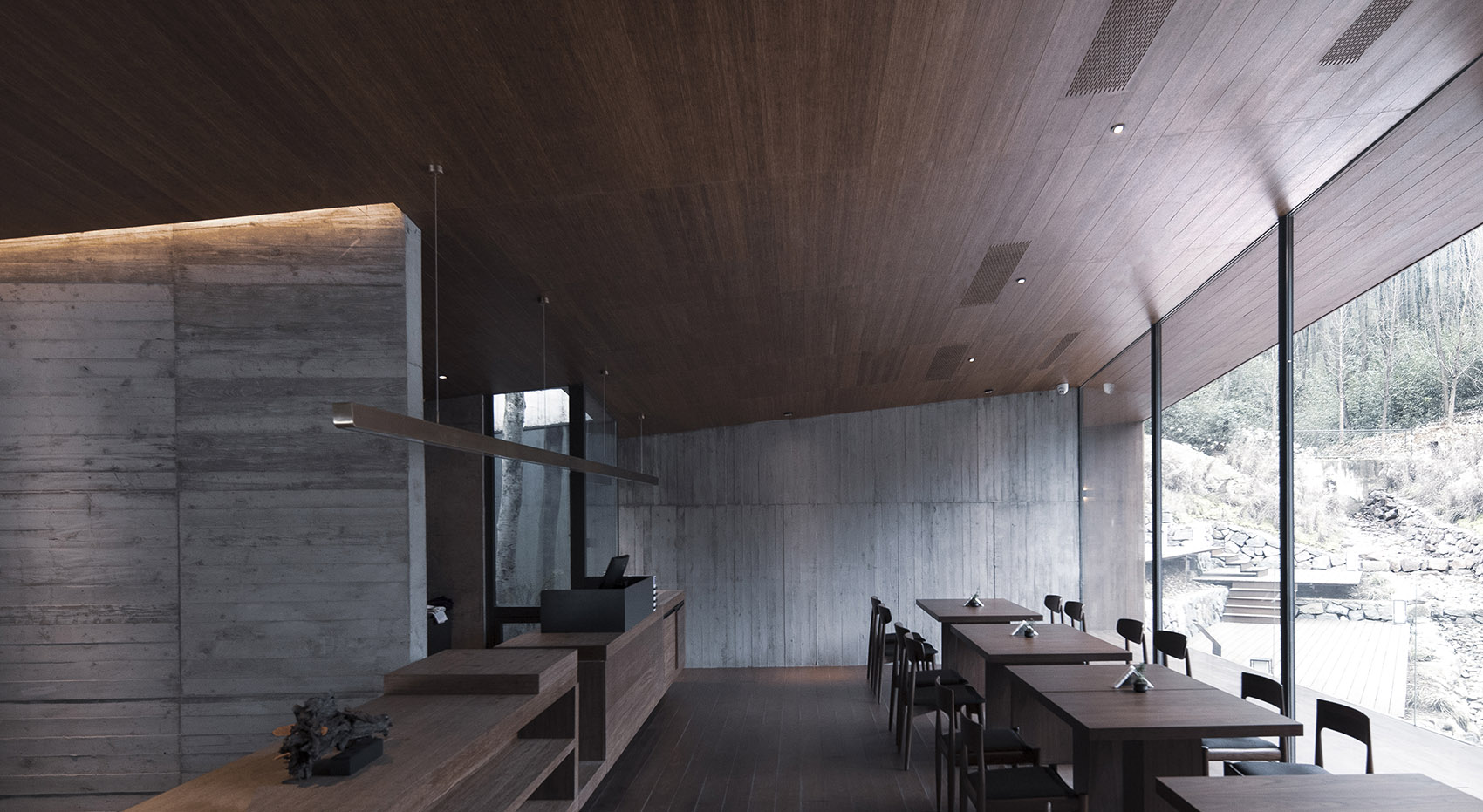 這是在杭州郊區(qū)山林里的一個休閑度假服務空間,設計是從具體的環(huán)境開始的,我們首先要思考的是做一個什么樣的空間裝置可以和這片山林對話,可以更好的順應地形并融入這片自然,場地的特殊條件決定了建筑的特殊性。