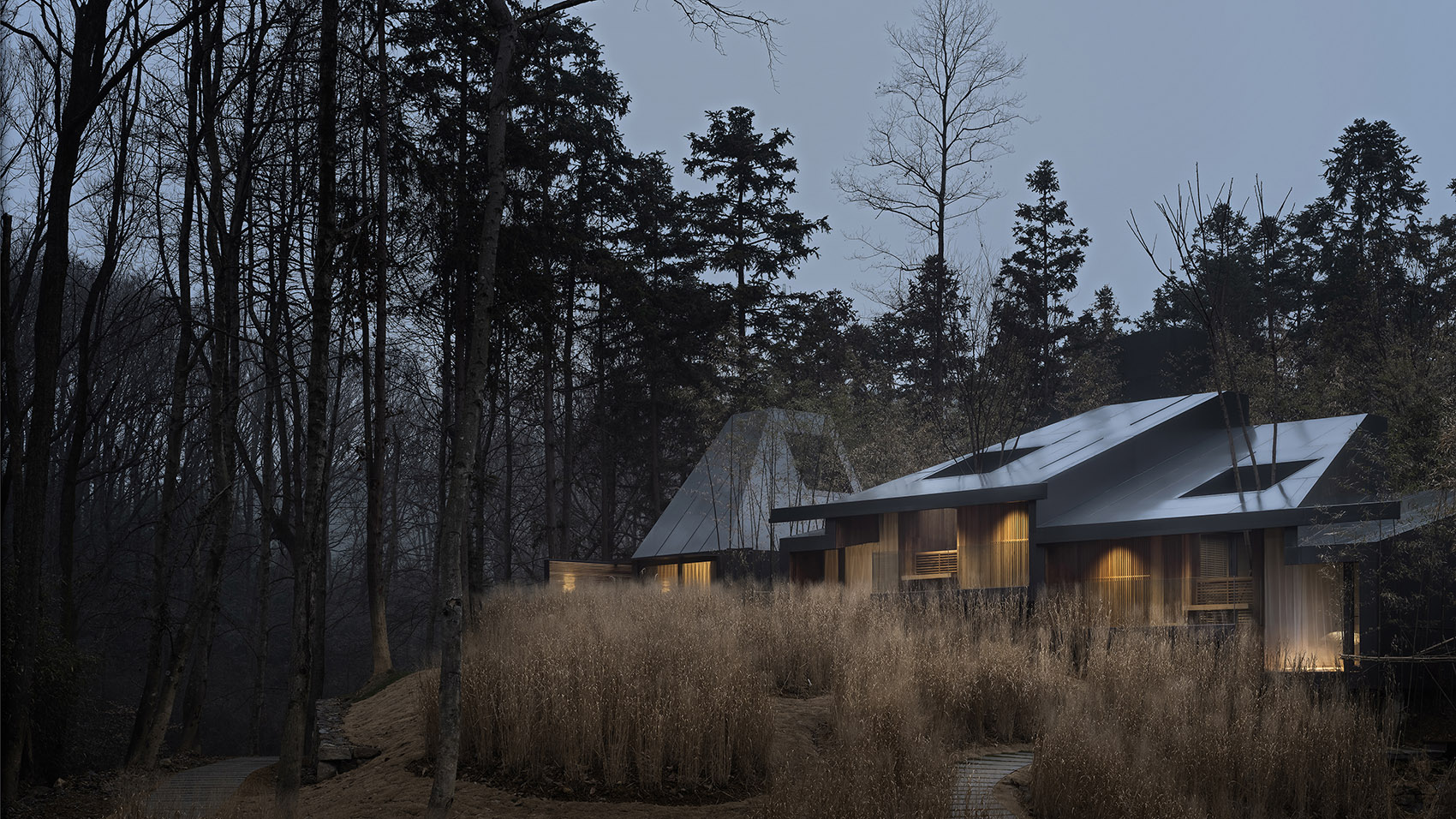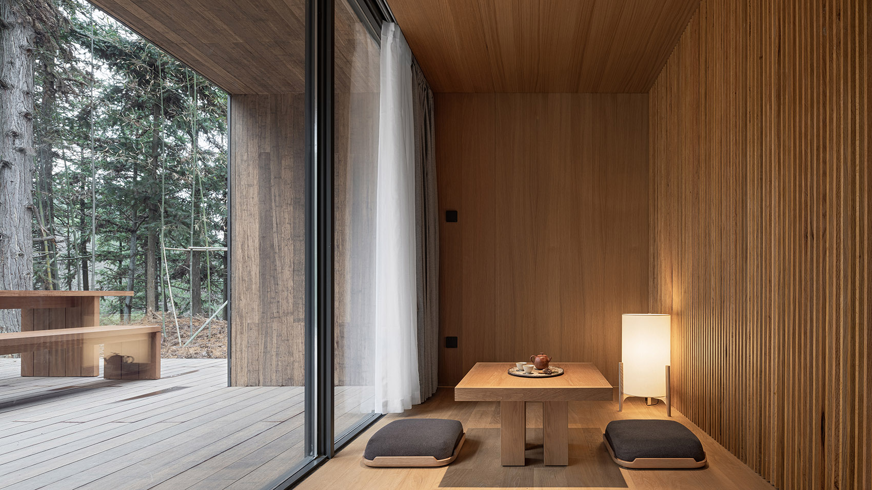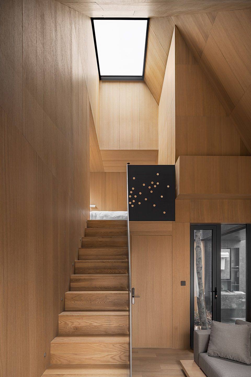 每個小屋中都保留了一棵場地原生的樹木,樹木所占據(jù)的空間成了屋中院,透過玻璃時刻于室內生活相伴,是自然向建筑的反向滲透,屋中院也為室內衛(wèi)生間提供了具有私密性的風景。