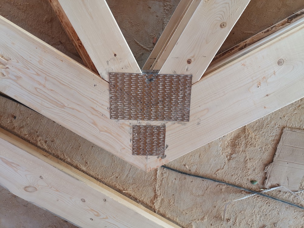 齒板連接主要用于輕型木結(jié)構(gòu)建筑中規(guī)格材制成的輕型木桁架節(jié)點(diǎn)連接。輕型木桁架是北美輕型木結(jié)構(gòu)體系中屋架體系的主要結(jié)構(gòu)形式。其特點(diǎn)是支撐形式靈活,桁架間距較密,通常小于600 mm。在桁架連接處應(yīng)用齒板,可以較快的進(jìn)行桁架中各弦的定位。即在工廠中拼裝好一品桁架后,將桁架平放,同時(shí)用專門(mén)的壓力機(jī)將齒板直接壓入桁架中各條弦之間的連接處。齒板連接其最大的優(yōu)點(diǎn)是提高了施工效率,保持了木材的完整性。同時(shí)齒板作為連接件,與木材之間表現(xiàn)較好的協(xié)同作用,塑性性能良好。